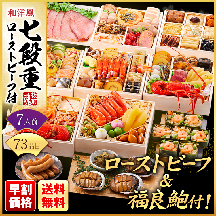おせち販売累計で全国でもトップクラスのおせち専門店。合計73品目のおどろきの品揃えときらびやかな見た目とその美しさは新春の門出にはぴったり。ひとつひとつに職人の技が感じられるたいへん豪華な高級おせちです。家族や親戚がたくさん集まるご家庭でもこのサイズなら間違いありませんね。